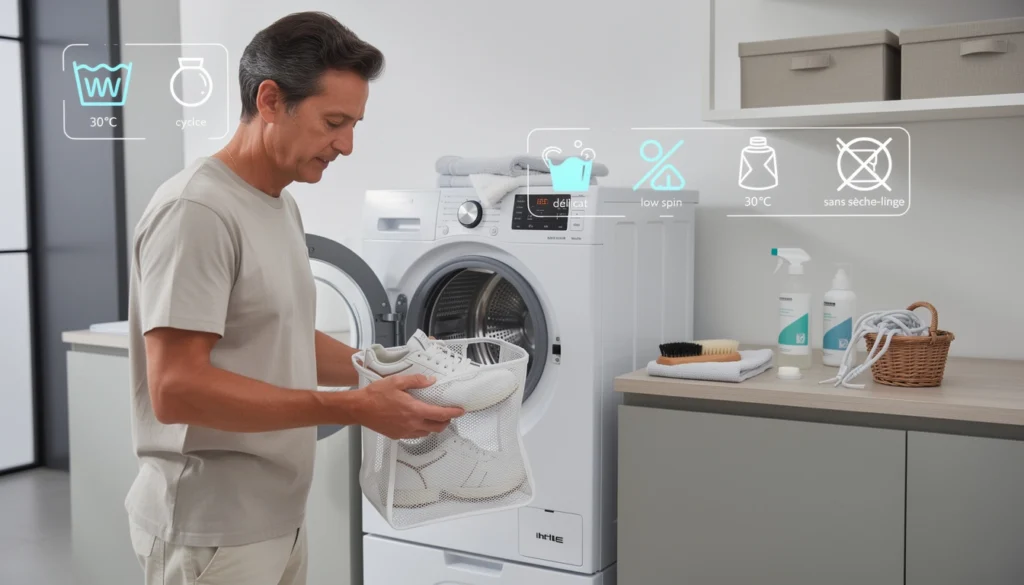 De nombreuses machines à laver modernes disposent d’un programme spécifique pour les chaussures. Si votre lave-linge en est équipé, c’est l’option idéale. À défaut, choisissez un cycle délicat ou synthétique. Ces programmes utilisent des mouvements de tambour plus doux et des rinçages plus abondants, ce qui est parfait pour prendre soin de vos baskets. Évitez les cycles intensifs ou destinés au linge très sale, car ils pourraient être trop agressifs pour vos chaussures. Un lavage en machine bien réalisé peut prolonger significativement la durée de vie de vos baskets, à condition de respecter les précautions nécessaires.